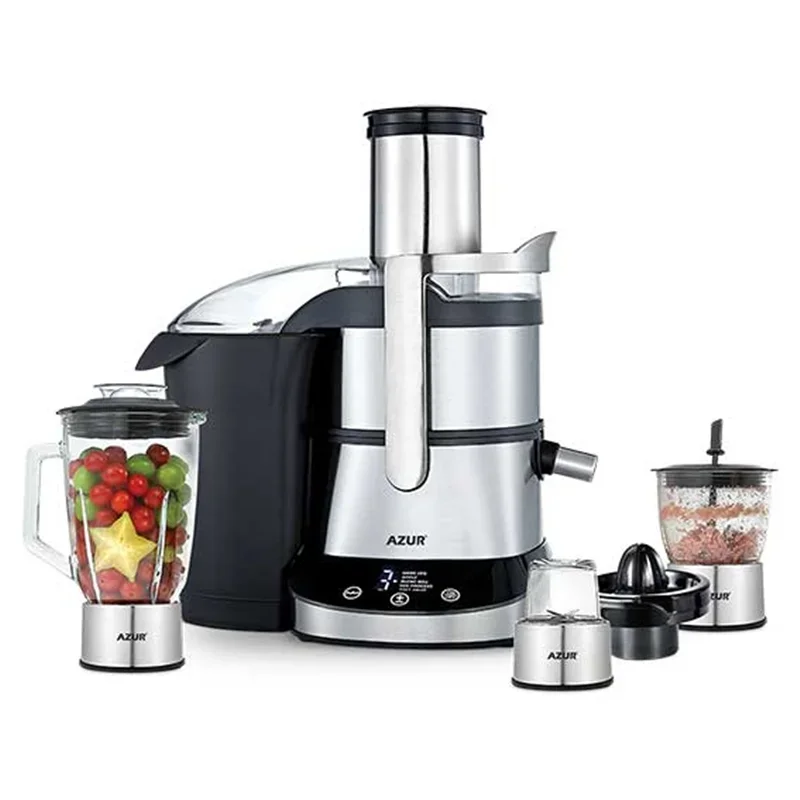آبمیوه گیر 5 کاره آزور مدل AZUR AZ -204JB دارای قابلیتهای آب مرکباتگیری، مخلوط کنندگی و آسیاب کنندگی هم است و تمامی اینکارها را با بهترین کیفیت انجام میدهد. مخزن مخلوط کن و آسیاب کن از جنس شیشه ضخیم بوده و پارچ یا مخرن آبمیوهگیری از جنس پلاستیک شفاف است