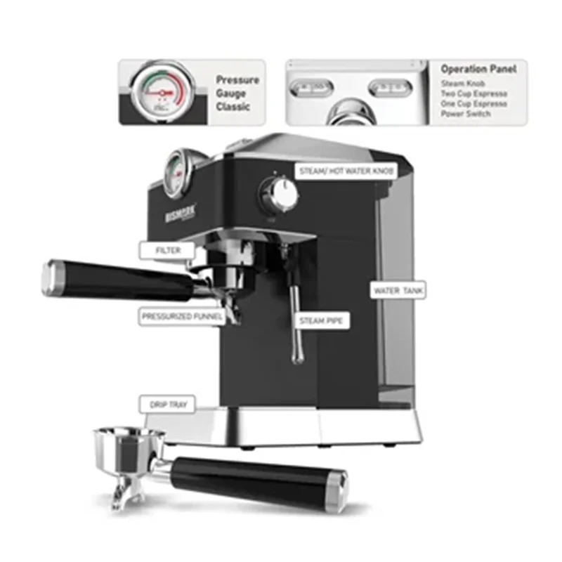 اسپرسوساز بیسمارک مدل BM2263 محصول برند آلمانی بیسمارک است. این دستگاه تحت لیسانس و با تکنولوژی برند بیسمارک آلمان در کشور چین تولید می شود. توان این اسپرسوساز 2200 وات است و بسیار قدرتمند است. فشار بخار این محصول 20 بار است و می توانید انواع قهوه های خوشمزه را با استفاده از آن تهیه کنید. همچنین می توانید با استفاده از این دستگاه کف شیر تهیه کنید. مخزن آب این محصول دارای نشان گر میزان آب است و می توانید آن را به راحتی از دستگاه جدا کنید. به یاد داشته باشید که رسوب ذرات و املاح آب ممکن است باعث ایجاد گرفتگی در لوله های مخزن شود. بنابراین استفاده از آب تصفیه شده و بدون املاح به افزایش طول عمر دستگاه کمک می کند. سیستم قطع کن خودکار این محصول باعث می شود پس از تهیه قهوه، حرارت دهی دستگاه به صورت خودکار متوقف شود. این سیستم به ایمنی بیشتر در هنگام استفاده از محصول کمک می کند. با این حال بهتر است زمان هایی که از دستگاه استفاده نمی کنید، اتصال برق آن را قطع کنید زیرا نوسان برق شهری ممکن است به موتور دستگاه آسیب برساند. از این محصول شیک و با کیفیت می توانید در منزل، محل کار، کافه ها و رستوران های کوچک استفاده کنید. مهم: این دستگاه فاقد مخزن جداگانه شیر میباشد و نباید در مخزن اب شیر بریزید و این کار سبب خرابی کلی دستگاه میشود.