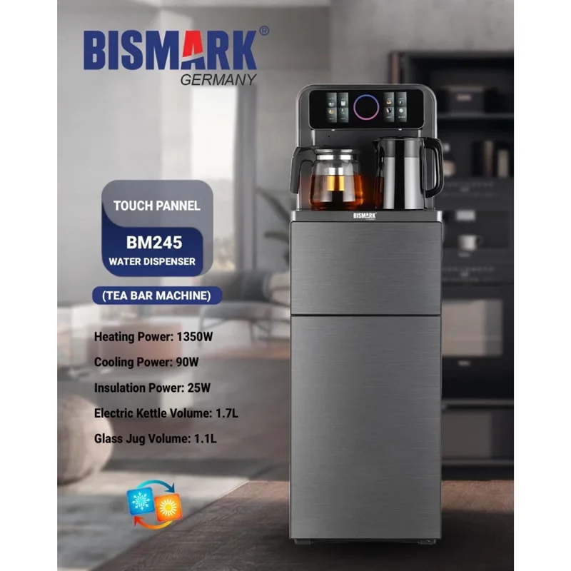 دستگاه حرفهای BM245 از بیسمارک، ترکیبی از آبسردکن و چایساز دیجیتال است. با توان سرمایش ۹۰ وات و گرمایش قدرتمند ۱۳۵۰ وات، امکانات بینظیر و طراحی مدرن، مناسب برای فضاهای خانگی یا اداری. این دستگاه دارای کتری برقی ۱.۷ لیتری و پارچ شیشهای ۱.۱ لیتری است که قابلیت ارائه آب گرم و سرد را بهصورت همزمان فراهم میکند. همچنین، یخچال داخلی، صفحه لمسی هوشمند، و قفل ایمنی کودک از نکات برجسته این مدل هستند.