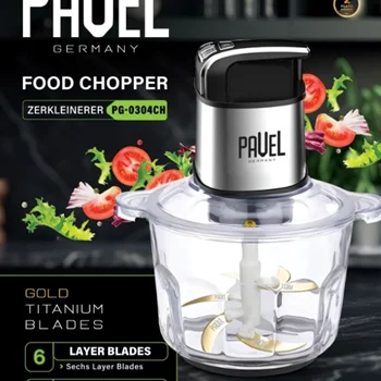 پاول یکی از برند های معتبر لوازم خانگی می باشد که به سراتاسر جهان لوازم خانگی صادر می کند این محصول با قدرت موتور سیم پیچی وات می باشد و دارای سنسور حرارتی می باشد و قطع کن اتوماتیک می باشد، خردکن 5 لیتر پاول مدل PG-0304CH دارای شش تیغه از جنس استیل طلایی 6 لایه ضد خش و زنگ مرغوبترین نوع استیل بسیار برنده ساخته شده است و مصرف انرژی AAAاین محصول دارای مخزن استیل مقاوم نشکن و ظرفیت 5 لیتری بزرگ ساخته شده است و دیگر محسنات این محصول دارای شفت فلزی می باشد که دیگر خورندگی و و مقاومت آن بسیار فوق العاده می باشداز این محصول برای سبزی خردکردن و پیاز و هویچ و پوره کردن گوشت و دیگر محصولات بکار می رود.
