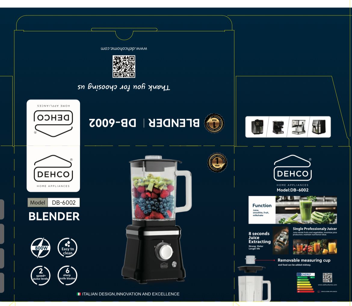 مخلوطکن دهکو مدل DB-6002 با طراحی ایتالیایی یک دستگاه حرفهای، قدرتمند و مناسب برای تهیه انواع اسموتی، شیک، نوشیدنیهای طبیعی، سس و حتی خرد کردن یخ است. این مدل با موتور 800 وات، تیغههای فولادی 6 پره بسیار تیز و طراحی مدرن، یکی از بهترین انتخابها برای آشپزخانههای خانگی و کافیشاپها محسوب میشود.