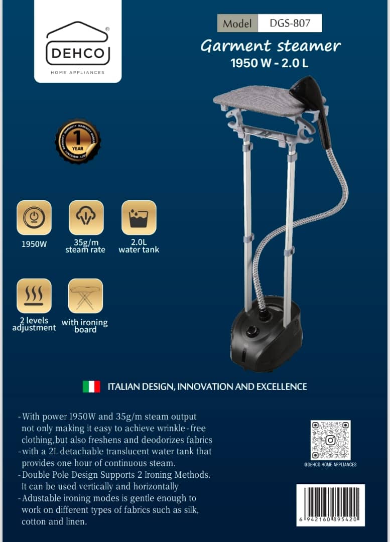 اتو بخار ایستاده DEHCO مدل DGS-807 با توان قدرتمند 1950 وات و طراحی حرفهای، گزینهای ایدهآل برای اتوکشی سریع، آسان و بدون آسیب به بافت لباس است. این دستگاه با تولید بخار یکنواخت و مخزن آب 2 لیتری، برای استفاده خانگی و نیمهحرفهای بسیار مناسب میباشد.
