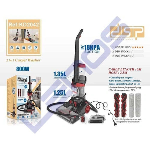 با دی اس پی مدل KD2042 میتونی فرش، مبل، پرده یا سطوح سخت مثل سرامیک رو با یک دستگاه بشوری. موتور قدرتمند ۸۰۰ وات با مخازن بزرگ، کار شستشو را تا حد زیادی راحت میکند و نیاز به پر و خالی کردن مکرر ندارد. طول کابل و لوله مناسب، این امکان را بهت میده تا به نقاط دور از پریز نیز دسترسی داشته باشی. دستگاه چندکاره بودن، یکی از بزرگترین مزیتهاشه — یعنی یک دستگاه برای چند نوع سطح و نیاز.