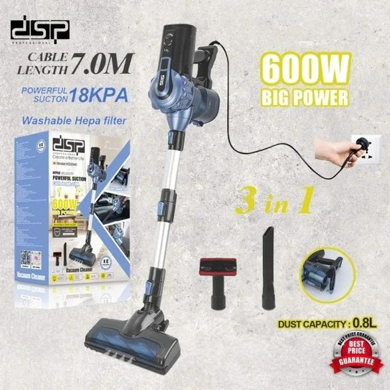 جارو برقی عصایی خانگی قدرتمند 600 وات ایستاده مجهز LED دی اس پی DSP مدل KD2040 توان مصرفی و موتور این دستگاه 600 وات است که عملکرد عالی ای را به جای می گذارد و یک توان بالا در جارو برقی های عصایی به شمار می رود. سری جارو دارای دو برس جداگانه است که برای جمع آوری گرد و غبار و زباله استفاده می شود. این نوع جارو دارای سری های قابل تعویض هستند که امکان استفاده از آن ها به عنوان جارو دستی یا جاروبرقی را فراهم می کند. که میتوان آن را جدا کرده و برای نظافت فضاهای کوچک و محدود مانند میز، مبلمان و خودرو مناسب است. ظرفیت مخزن این جارو برقی 0.8 لیتر است که حجم بالایی از گرد و غبار در آن جای می گیرد و تا چند بار بدون خالی کردن می توانید از آن استفاده کنید. همچنین دارای فیلتر قابل شستشو نیز می باشد. قدرت مکش این جارو برقی 18KPA می باشد و دارای مخزن گرد و غبار و زباله هستند که نیازی به استفاده از کیسه ندارند. این قابلیت برای نظافت راحت تر و بهداشتی تر است. این جاروبرقی تنها با وزن 1.7 کیلوگرمی سبک وزن به شما این امکان را می دهد تا بدون احساس خستگی به راحتی در خانه حرکت کنید. مکش قدرتمند 18KPA جنس بدنه استیل و پلاستیک مقاوم ظرفیت مخزن زباله 0.8 لیتر فیلتر قابل شست وشو طول سیم 7 متر به همراه دو عدد سری قابل تعویض قابلیت استفاده به صورت ایستاده و دستی است