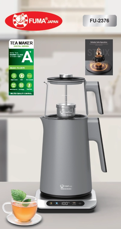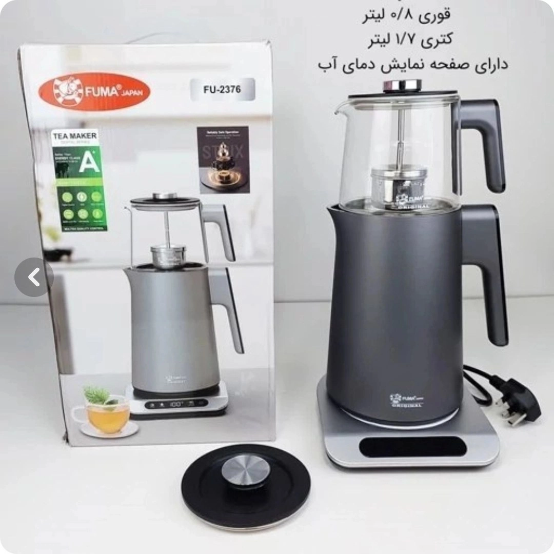 چایساز Fuma FU-2376 با ظرفیت کتری ۱.۷ لیتر و قوری ۰.۸ لیتر، نمایشگر دیجیتال و سیستم ایمنی خاموشی خودکار، انتخابی عالی برای دم نمودن چای سالم و خوشطعم.
