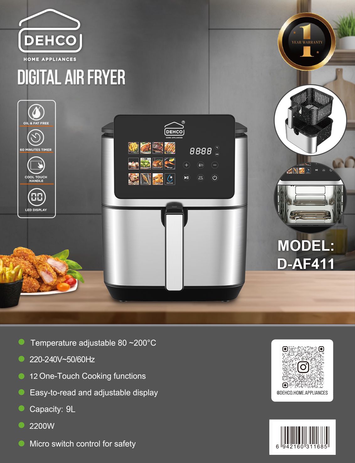 سرخکن مدرن و قدرتمند دهکو مدل D-AF411 با ظرفیت بزرگ ۹ لیتر و دو المنت پرقدرت، به شما امکان میدهد غذاهای سرخشدهای ترد و سالم تهیه کنید، حتی با حداقل مقدار روغن یا کاملاً بدون روغن. این دستگاه با طراحی دیجیتال، ۱۲ برنامه پخت متنوع و کنترل لمسی، تجربه آشپزی حرفهای و در عین حال سادهای ارائه میدهد.