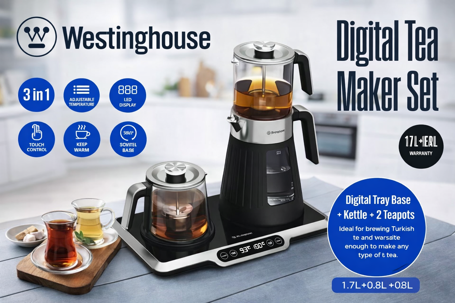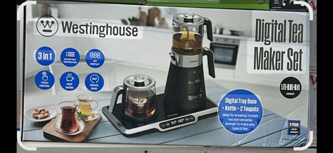 چایساز دیجیتال Westinghouse یک ست کامل و مدرن برای تهیه انواع چای است که با طراحی شیک، کنترل لمسی و عملکرد ۳ در ۱، تجربهای حرفهای از دمآوری چای را در خانه یا محل کار فراهم میکند. این دستگاه با پایه دیجیتال، کتری برقی و دو قوری مجزا، برای دم کردن چای ترک، چای ایرانی و انواع دمنوش ایدهآل است.